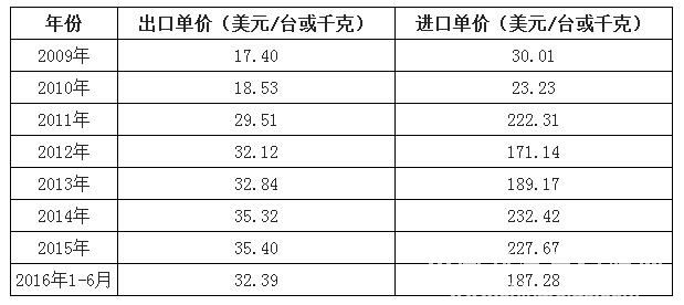 表2 2009—2016年6月中国冷藏箱、冷冻箱及其他制冷设备进出口价格对比
