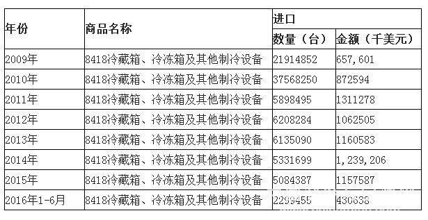 表1 2009—2016年6月中国冷藏箱、冷冻箱及其他制冷设备进口统计